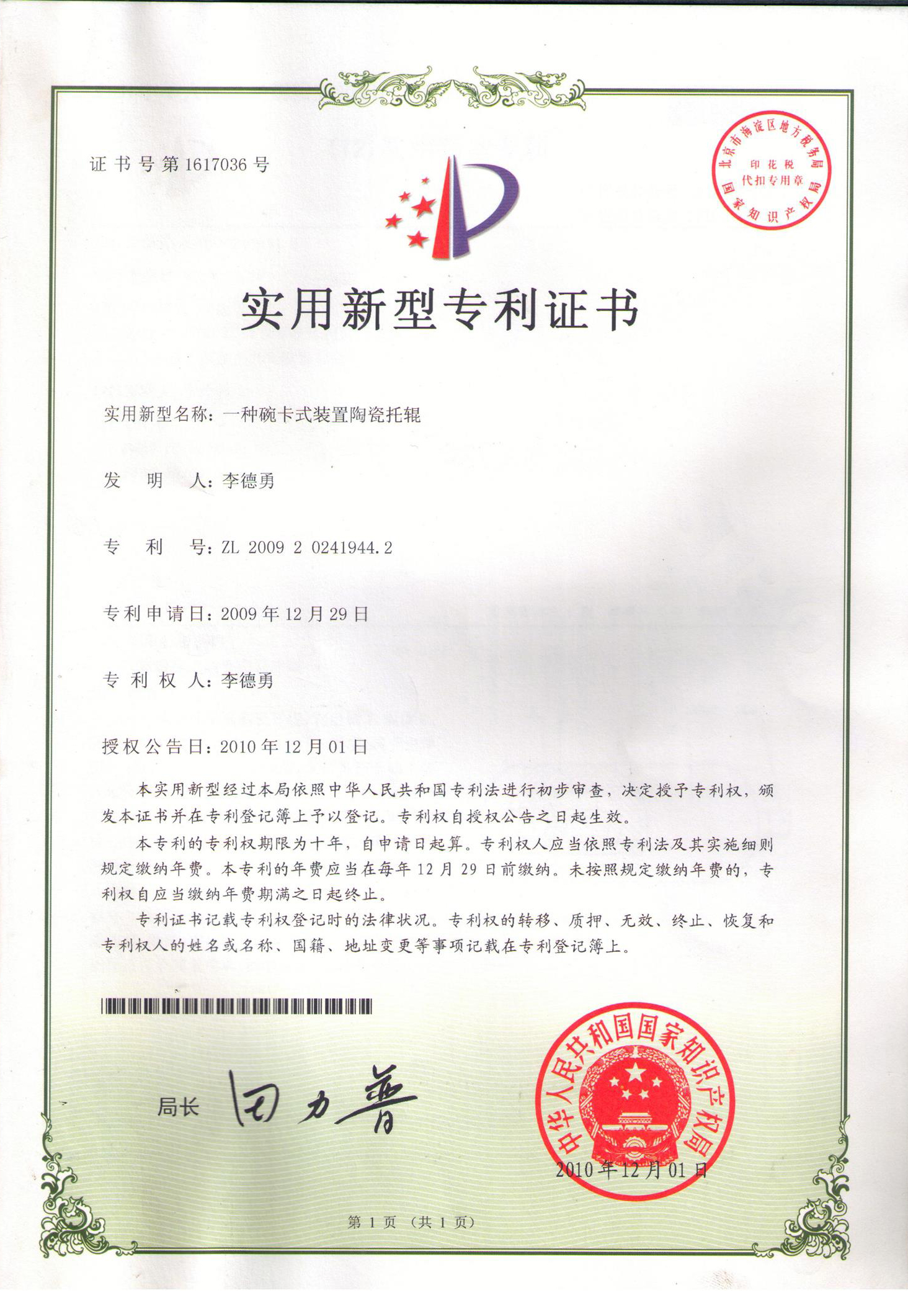 碗卡式耐磨陶瓷托輥專(zhuān)利證書(shū)